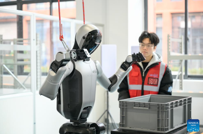 A humanoid robot is trained to carry objects at the Sichuan Humanoid Robot Multimodal Data Collection and Testing Center in Zigong City, southwest China’s Sichuan Province, Jan. 8, 2026. (Xinhua)